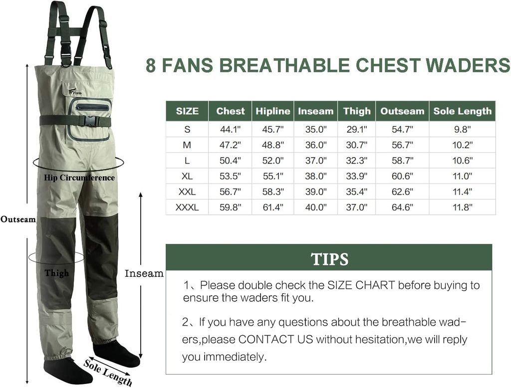 Меряйте обхваты в той одежде, в которой будете носить забродники: флис, термобельё. Запас 1–2 дюйма по груди и бёдрам не помешает.